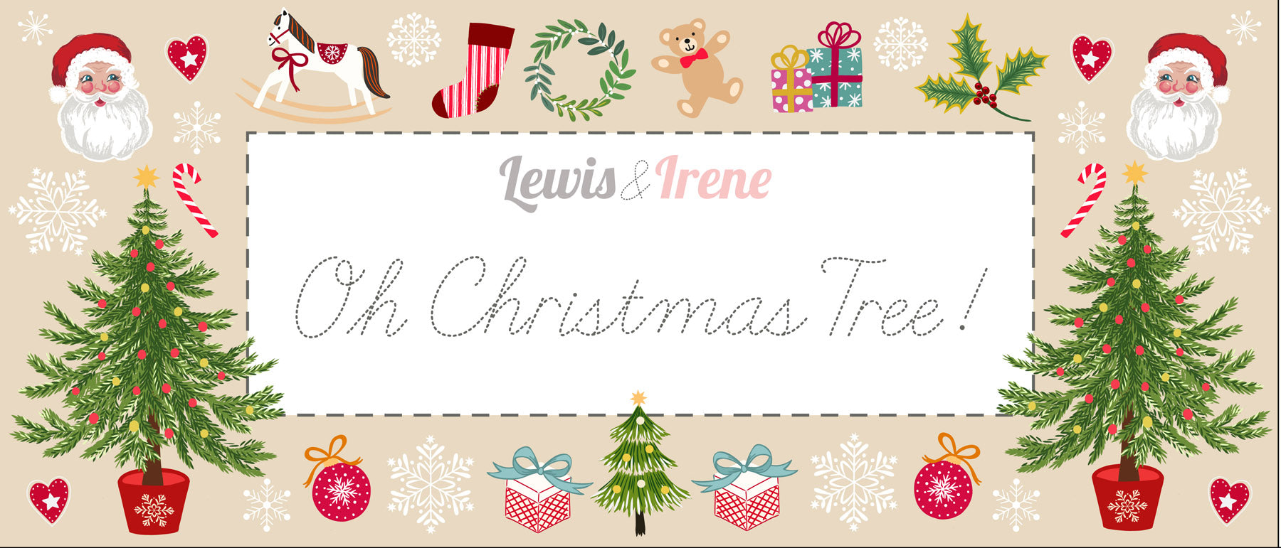 Description: "Oh Christmas tree – a place for Santa to leave his gifts, to sit around drinking warm drinks, to loudly sing festive songs or to bring a little magic to a room with its twinkling lights. How we love you, Oh Christmas tree! A traditional Christmas collection with some Lewis & Irene fun. Santa has pearl snowflakes, the baubles have a glimmer of gold".